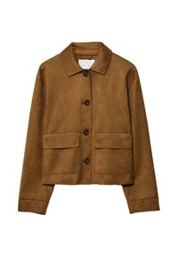 Tmavomodrá semišová bunda s dvoma prednými vreckami, zapínaním na gombíky a voľným strihom, doplnená pruhovaným modro-hnedým svetrom a tmavými džínsami.