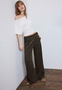 Žena v bielom tričku s odhalenými ramenami a tmavej asymetrickej sukni s kovovými cvočkami, ruky si upravujú tričko pri páse.