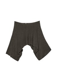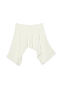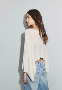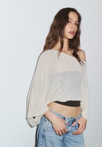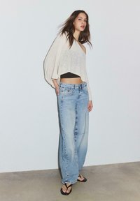 Žena nosi voľný smotanovo biely sveter cez čierny crop top a svetlomodré džíny s širokými nohavicami, stojaca pred jednoduchou svetlosivou stenou.