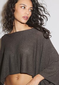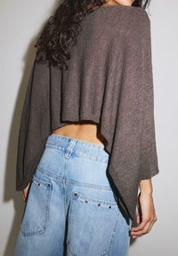 Žena s kučeravými vlasmi, oblečená v tmavohnedom asymetrickom svetri s odhalenými ramenami a svetlomodrých džínsach s vysokým pásom, pózujúca na bielom pozadí.