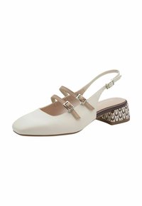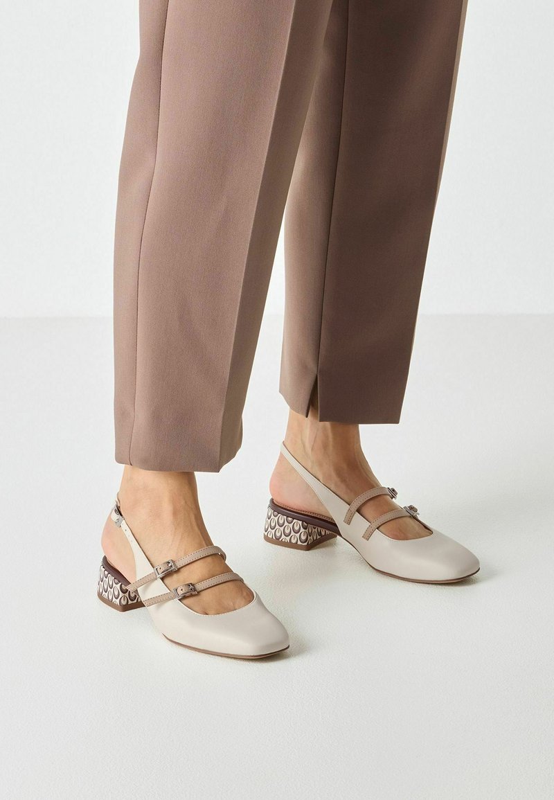 Béžové kožené slingback topánky so štvorcovou špičkou, dvoma nastaviteľnými remienkami a vzorovaným širokým opätkom v odtieňoch hnedej a krémovej farby.