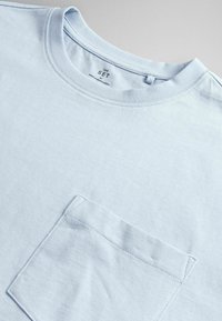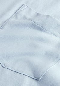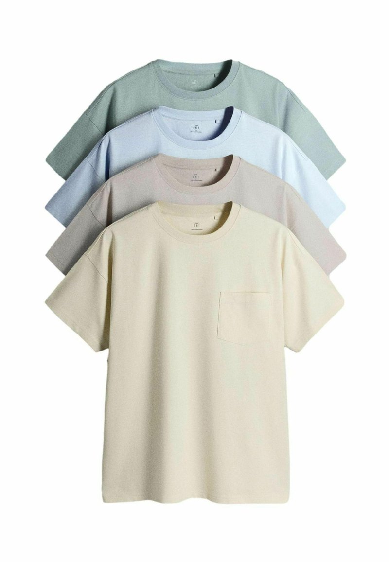 Štyri jednofarebné tričká s okrúhlym výstrihom a krátkymi rukávmi, naskladané na seba v pastelovo zelenej, modrej, béžovej a krémovej farbe, pohľad spredu.