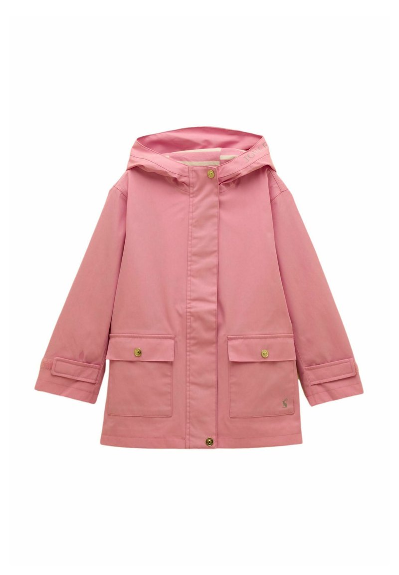 Ružová nepremokavá bunda s kapucňou, zapínanie na cvoky, dva vrecká s klopami na gombíky a nastaviteľné remienky na zápästiach dlhých rukávov.