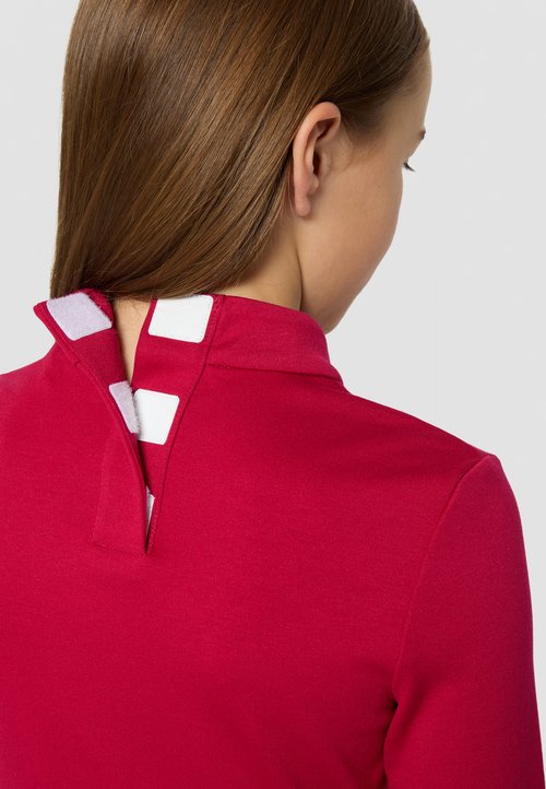 Červené šaty s dlhým rukávom a priliehavým telom, s rozšírenou sukňou, v kombinácii s čiernymi čižmami po kolená a čiernym batohom. Hladká látka.