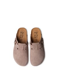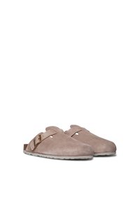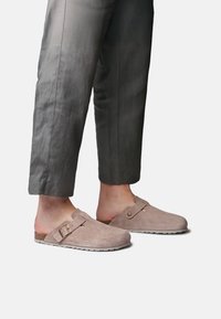 Osoba nosiaca sivé nohavice a béžové semišové nazúvacie šľapky s nastaviteľnými prackami, stojaca na jednoduchom bielom pozadí.