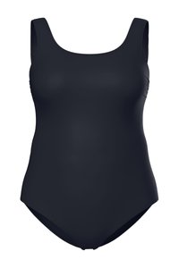 Sebavedomá žena s dlhými tmavými vlasmi, oblečená v čiernych bezrukávových jednodielnych plavkách, pózujúca na bielom pozadí.
