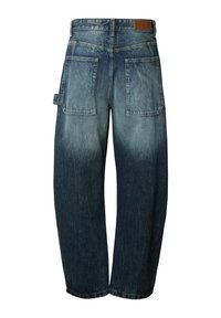 Džínsy z denimu s voľným strihom a prechodovým vyblednutím. Tmavomodré navrchu, postupný prechod do svetlejšej modrej. Obsahujú predné vrecká a zips.