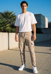 Muž nosi béžové cargo jogger nohavice so sťahovacou šnúrkou v páse a čierne, sivé a biele tenisky stojí pred jednofarebným pozadím.