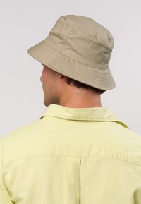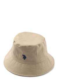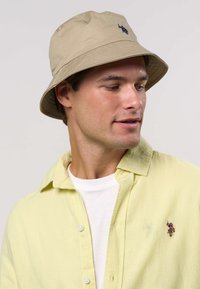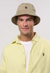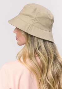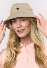 Béžový klobúk v štýle vedra s tmavomodrým logom. Klobúk má široký okraj a hladkú textúru, doplnený svetloružovou košeľou s golierom.