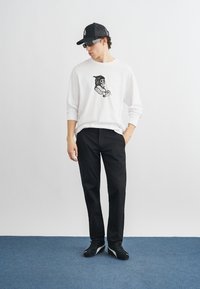 Osoba oblečená v čiernych rovno strihaných nohaviciach, čierno-bielych teniskách a bielej dlhorukávovej košeli s jednou rukou v vrecku.