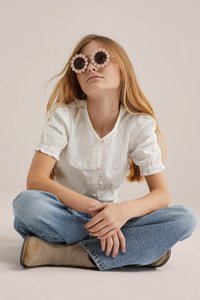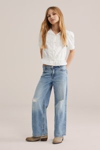 Mladé dievča s dlhými blond vlasmi, oblečené v bielej textúrovanej blúzke, širokých roztrhaných modrých džínsoch a béžových členkových topánkach, stojace s rukami za chrbtom.