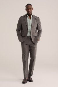 Muž v sivom obleku s mentolovo zelenou košeľou a hnedými mokasínami stojí s rukami v vreckách na jednoliatom pozadí.