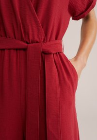 Žena nosi červený krátky overal s opaskom a širokými nohavicami, stojí s jednou rukou v vrecku a neutrálnym výrazom.