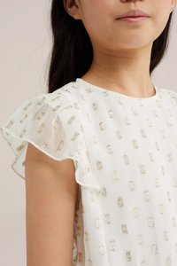 Mladé dievča s dlhými tmavými vlasmi v bielych šatách so zlatými bodkami, s motýlikovými rukávmi a opaskom previazaným v páse, stojace pred béžovým pozadím.