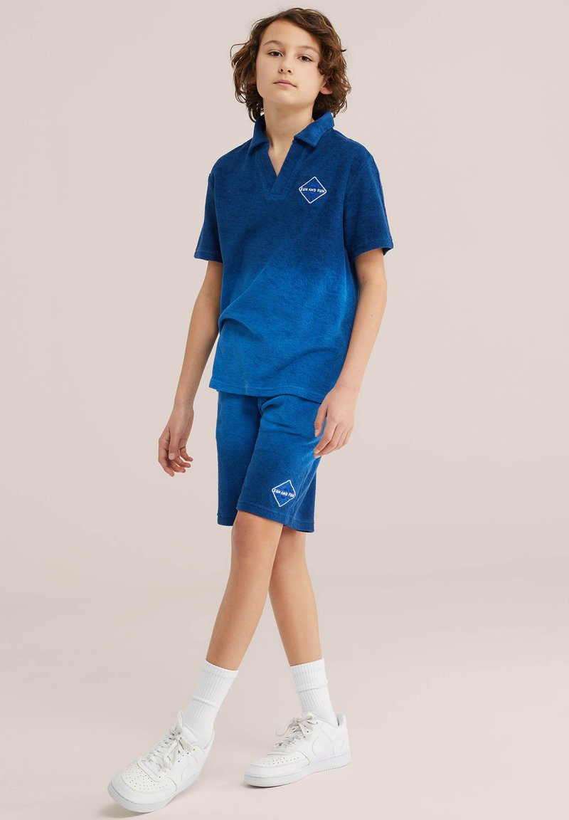 Dieťa stojace oblečené v modrom krátkornom póle a zodpovedajúcich krátkych nohaviciach so bielymi teniskami a ponožkami na neutrálnom pozadí.