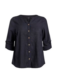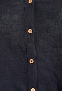 Tmavomodrá košeľa na gombíky z ľahkej látky s jemnou textúrou, s výstrihom do V, ohrnutými rukávmi a drevenými gombíkmi.