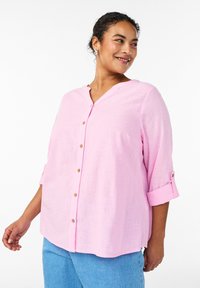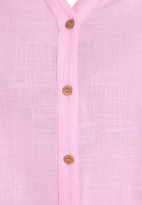Svetloružová košeľa na gombíky s výrezovým golierom, dlhými rukávmi zavinutými na manžetách a drevenými gombíkmi, vyrobená z textúrovanej látky.