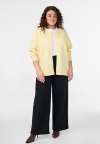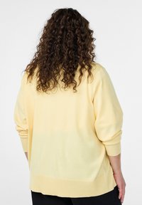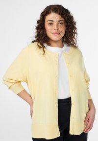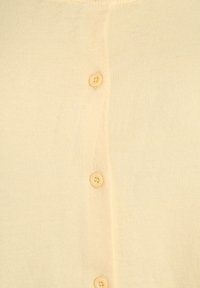 Svetložltý sveter na zapínanie z mäkkej pleteniny. Má zaoblený výstrih, zapínanie na gombíky a rebrovaný lem a manžety.