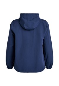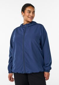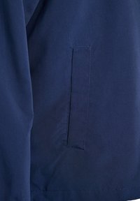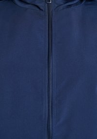 Tmavomodrá bunda na zips s kapucňou, vybavená elastickými manžetami, dvoma bočnými vreckami a hladkou, ľahkou textúrou.