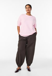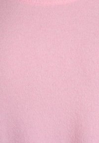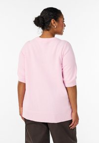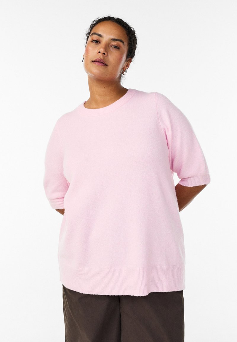 Svetloružový pulóver s krátkymi rukávmi vyrobený z mäkkého materiálu, s guľatým výstrihom, rebrovanými manžetami a voľným strihom.